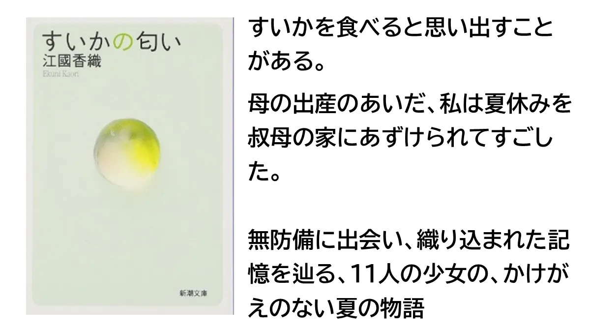 表題となっている『すいかの匂い』では、主人公は幼少期に親戚の家に預けられた時に感じた寂しさ、そして見ず知らずの人の家で泣きながら食べた時のすいかの匂いを、大人になっても、すいかを食べるたびに蘇ってくる。